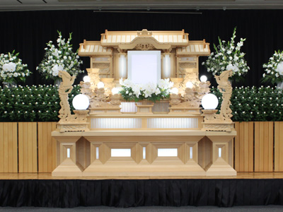- 故人を偲ぶにふさわしい格式高い白木祭壇に荘厳さと気品、そして新しさを加えた伝統と現代の融合。